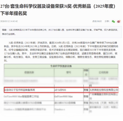 近日,儀器信息網(wǎng)公布3i 獎 - 優(yōu)秀新品(2025年度)下半年提名獎評選結(jié)果。北京英柏生物科技有限公司自主研發(fā)的全自動分子互作樣品制備系統(tǒng)(AP-MIP800)成功入選,在生命科學(xué)儀器及設(shè)備類27臺獲獎新品中占據(jù)一席。
