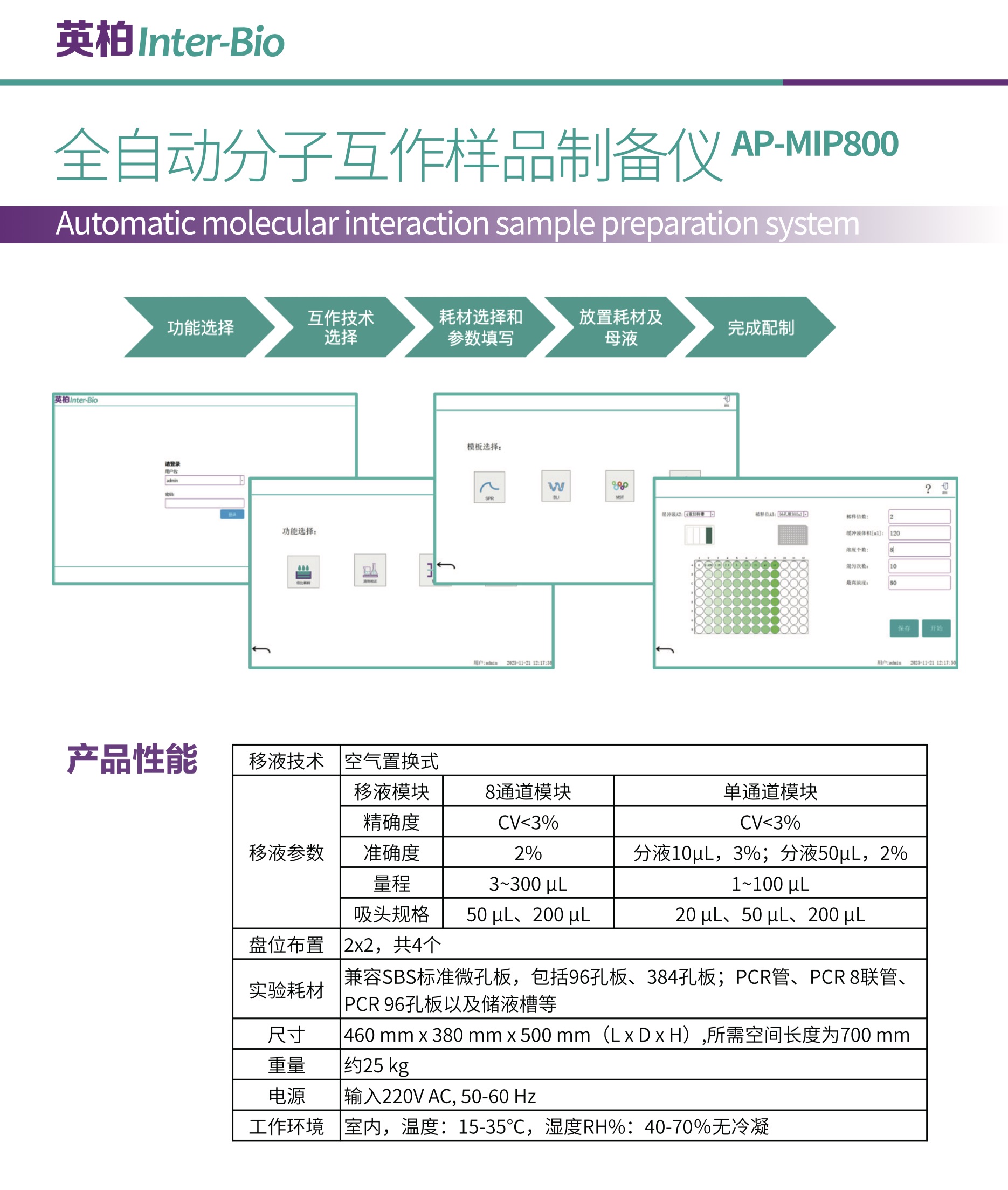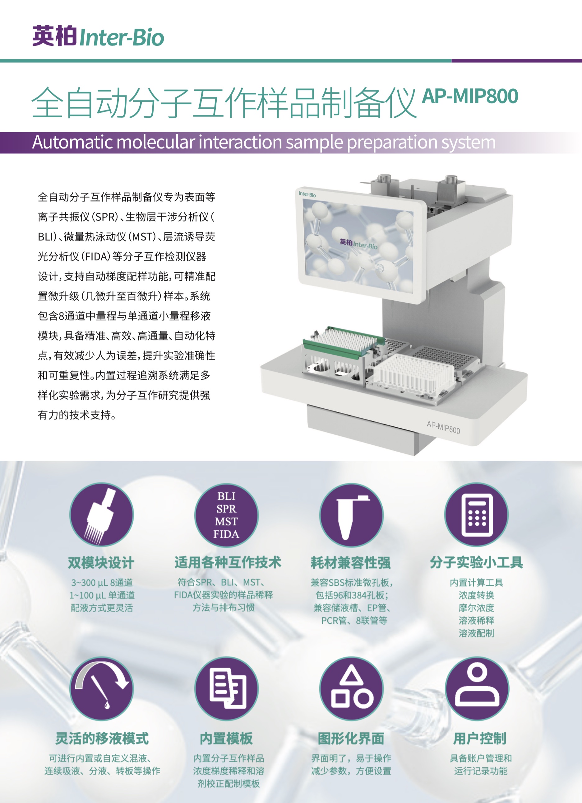 AP-MIP800專為SPR、BLI、MST、FIDA等分子互作檢測儀器設(shè)計,搭載8通道中量程與單通道小量程雙模塊移液系統(tǒng),可精準(zhǔn)配置幾微升至百微升樣本,精確度CV<3%,有效減少人為誤差,提升實(shí)驗(yàn)準(zhǔn)確性與可重復(fù)性。產(chǎn)品兼容SBS標(biāo)準(zhǔn)微孔板、PCR管等多種耗材,內(nèi)置自動梯度配樣、過程追溯系統(tǒng)與圖形化操作界面,為分子互作研究提供高效、可靠的自動化解決方案。